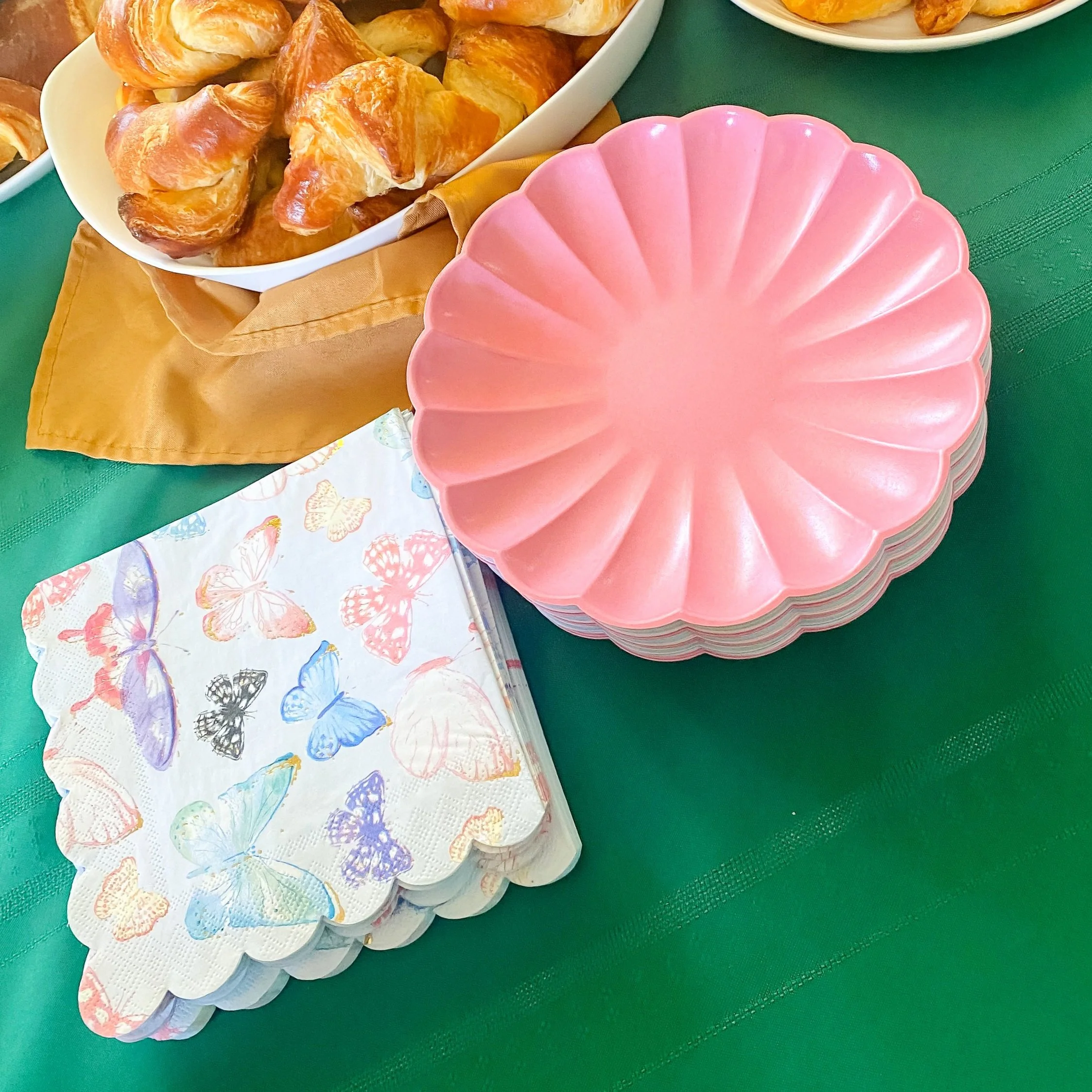 Along with my bouquet bar, flowers found their way into all aspects of this event! Since this was a more simple brunch, I didn’t do a lot of table decor but instead worked floral notes into the plates and napkins instead! I first found the beautiful and eco-friendly biodegradable Bamboo Pastel Flower Plates from the shop, Party Connoisseur, and couldn’t resist accenting them with these Scalloped Butterfly Napkins, because what goes better with flowers than butterflies!