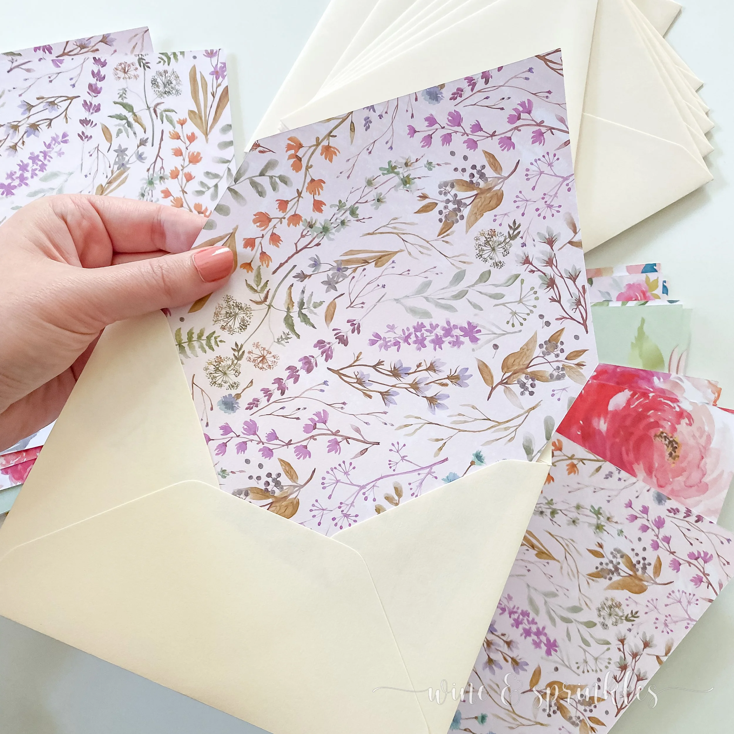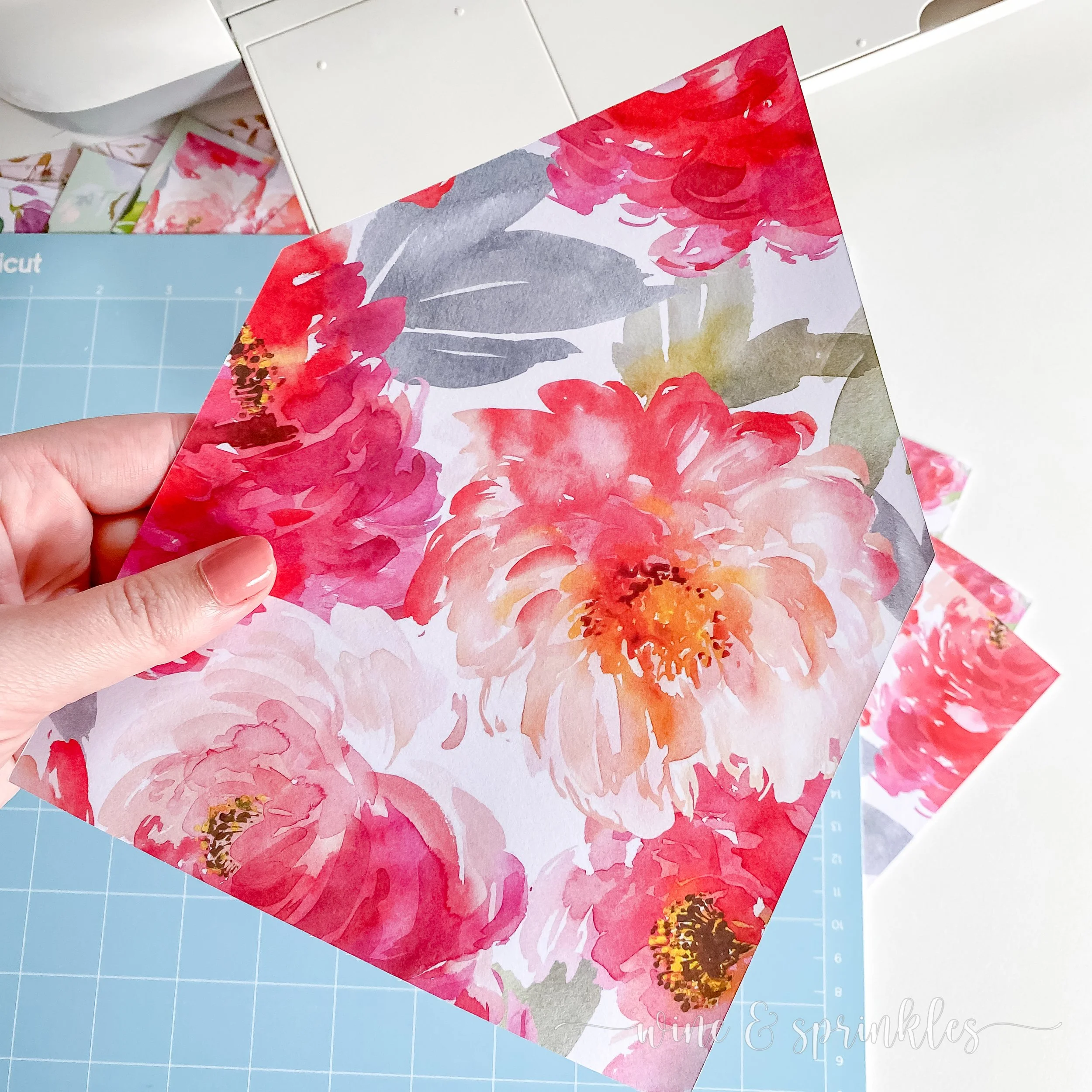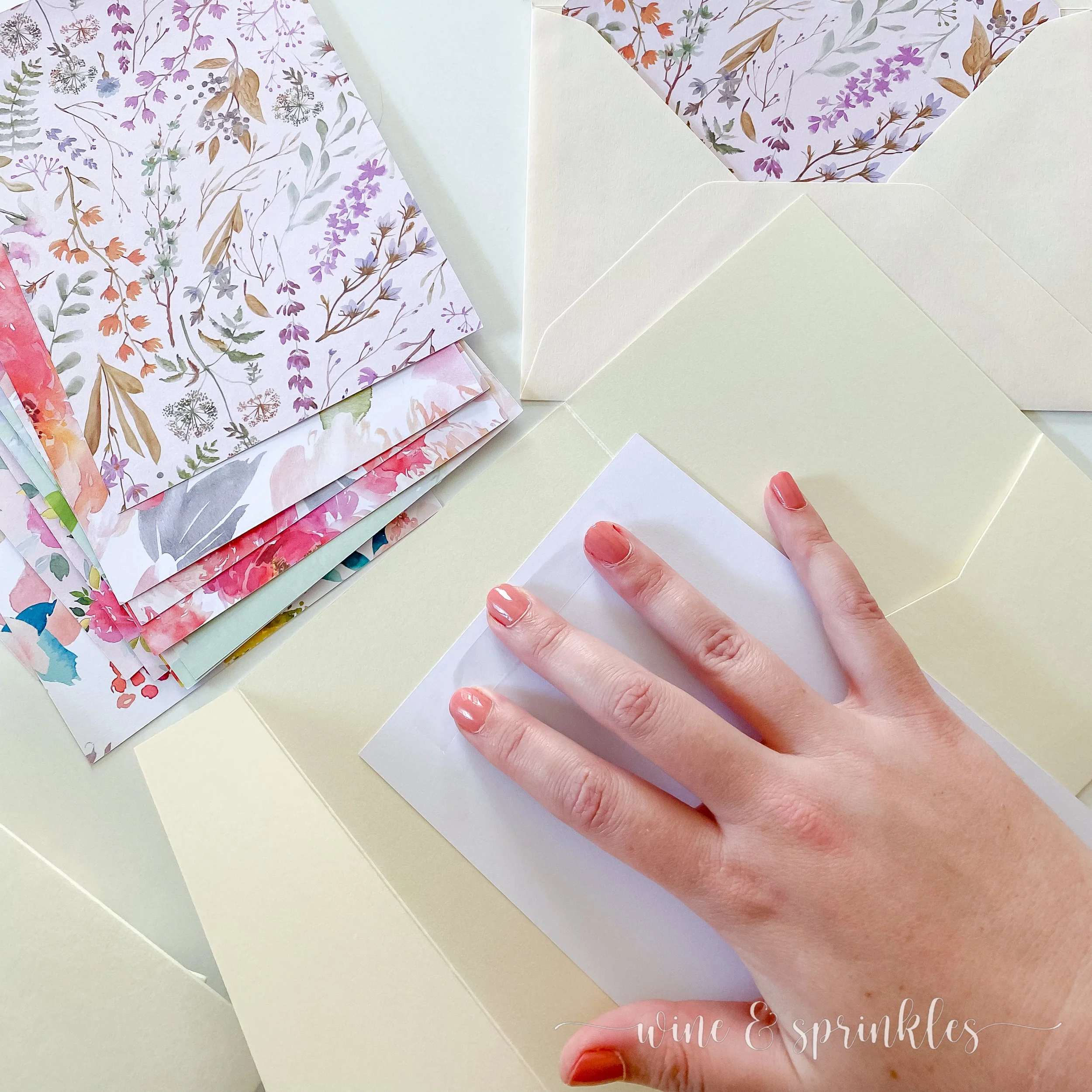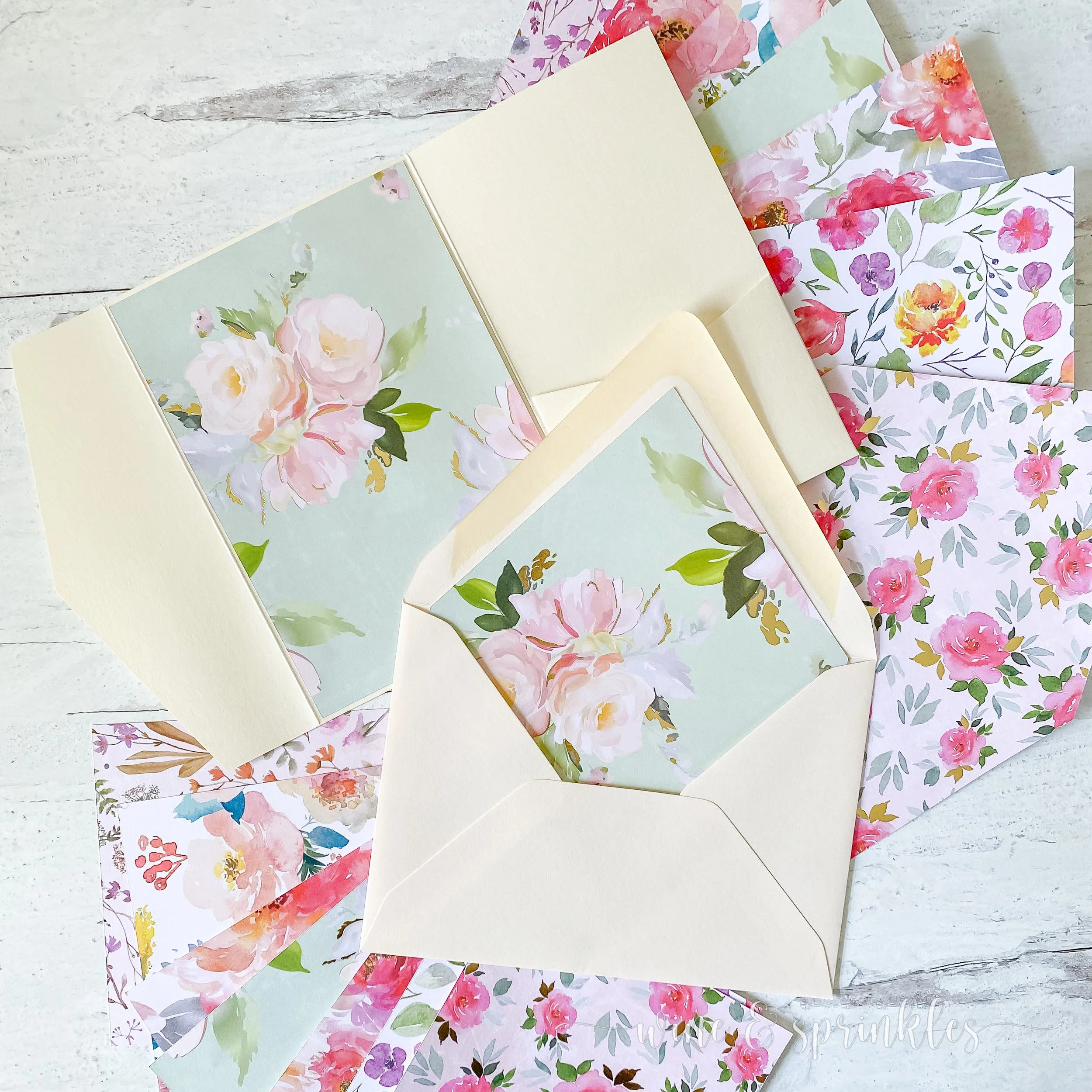 Scrapbook Paper: for creating these liners and invitation mats, scrapbook paper is the perfect patterned lightweight choice! You can find a floral multipack like I did from the store, download and print your own from Etsy, or find a favorite Floral Pack on Amazon; but for each liner and mat set you need one 12” x 12” sheet. These mats and liners are designed to fit the Euroflap A7 Envelopes and the A7 Pocket Folds that I get from my favorite DIY stationery supplier, Cards & Pockets!