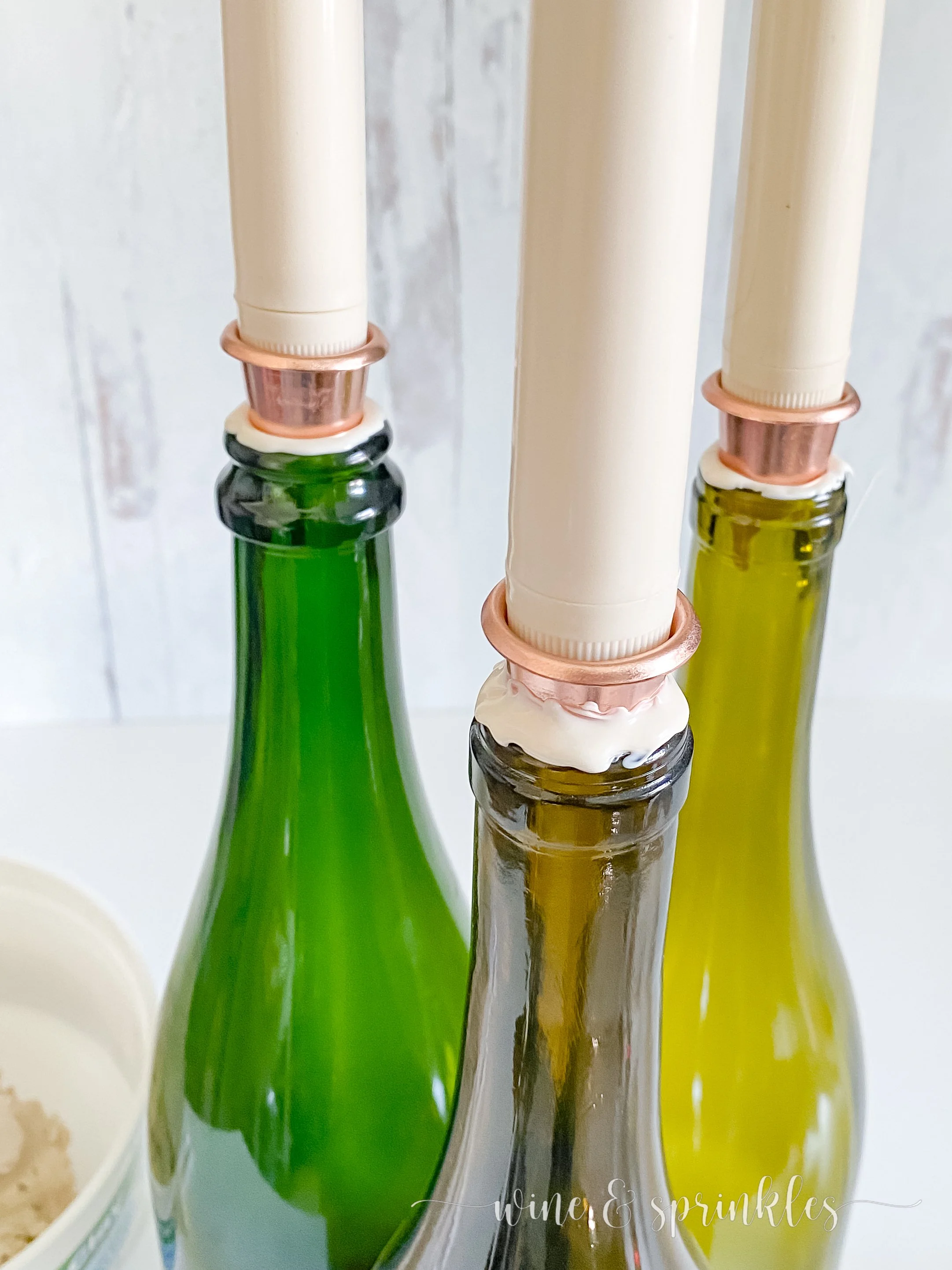 Empty Wine Bottles: empty wine bottles are the base of this project, but unlike my other wine bottle centerpieces, these bottles are becoming permanent candle holders rather than temporary vases like in my Wooden Flower Wine Bottle Centerpieces. Similar to other projects and centerpieces featuring bottles though, having a variety of heights give a lot more interest and dimension to the centerpiece!