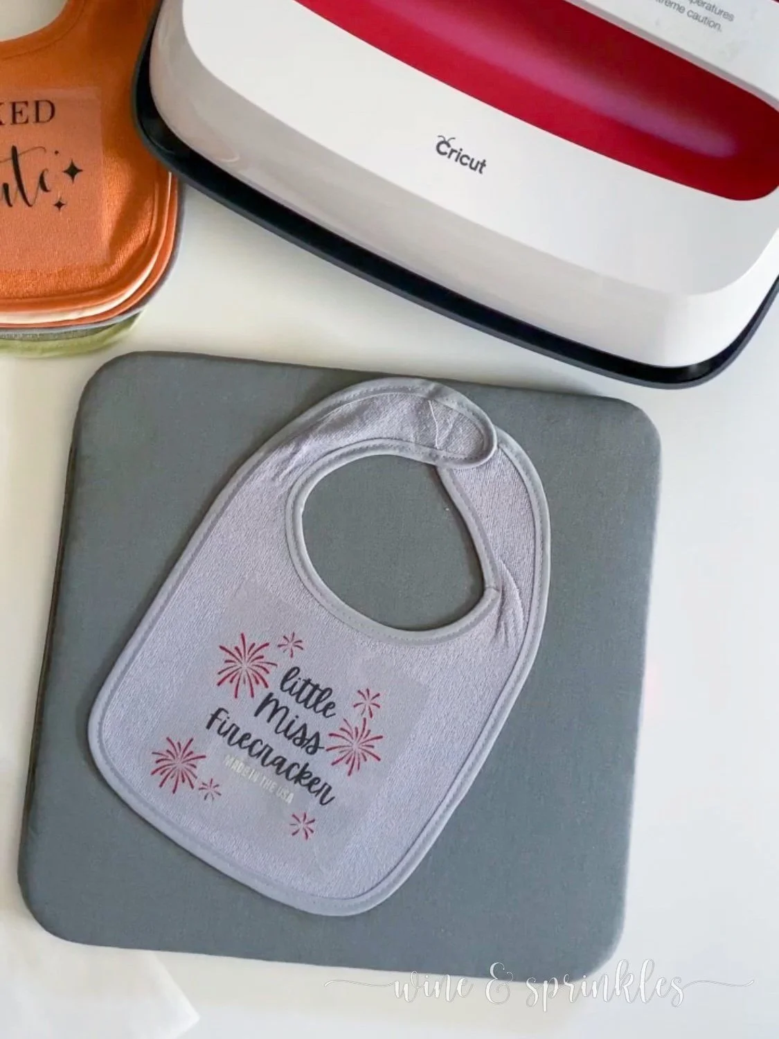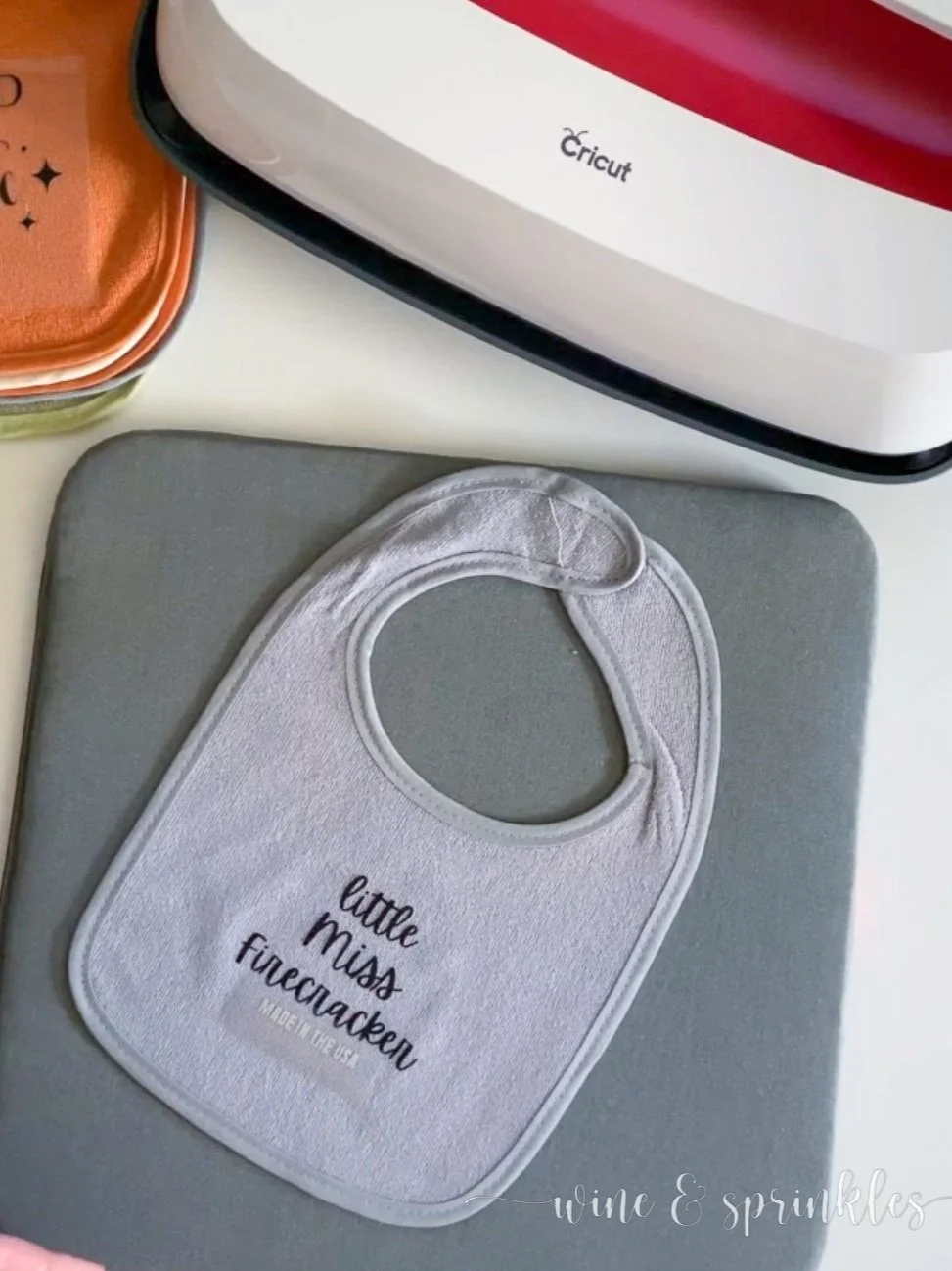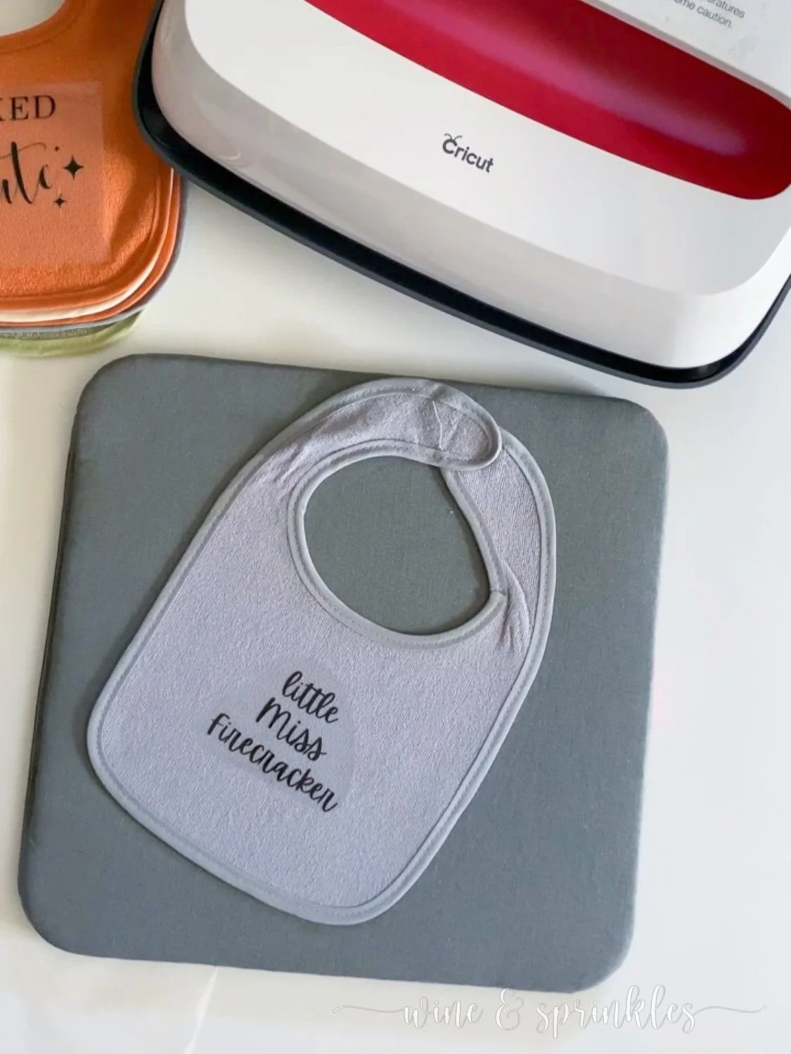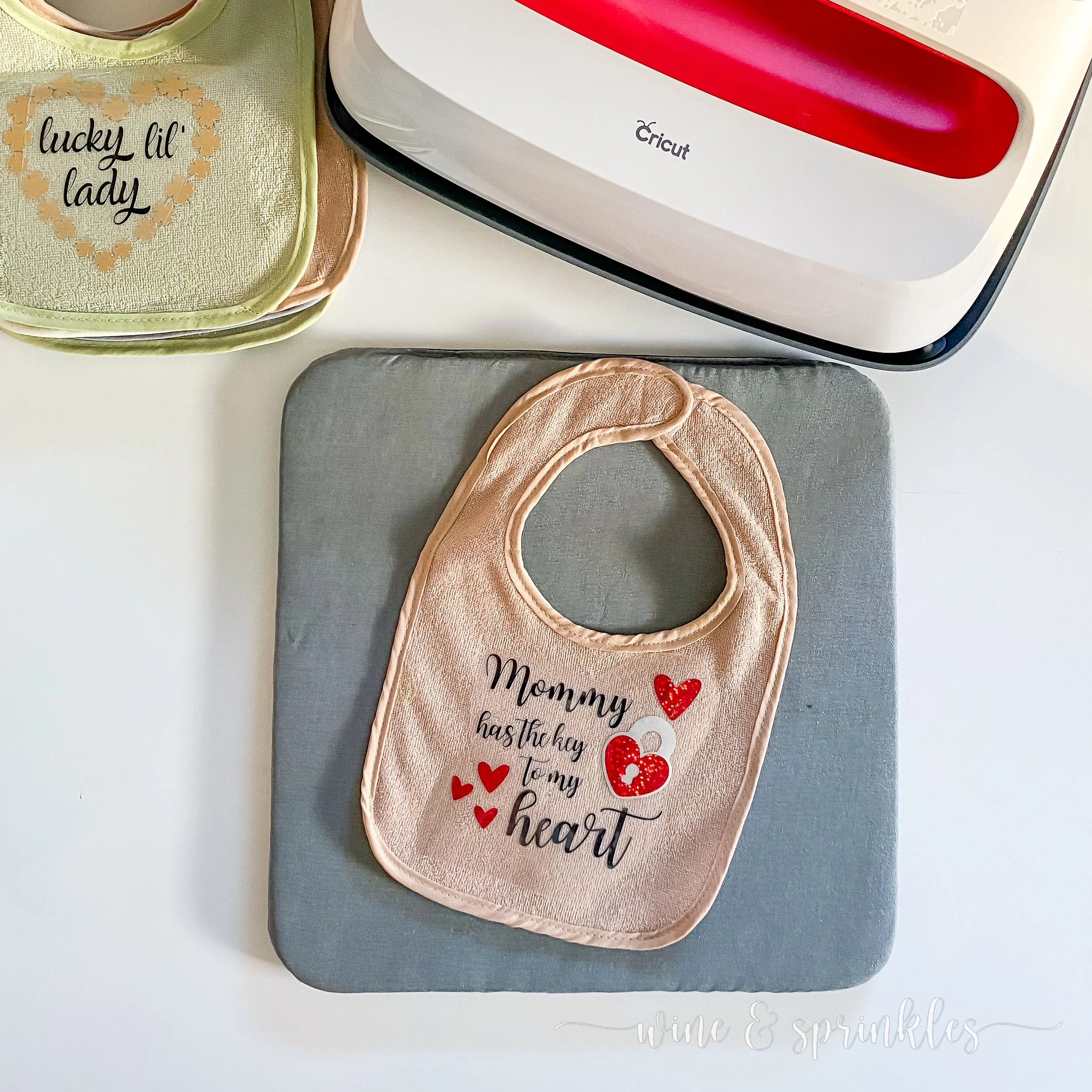 Cricut Heat Press: for transferring your decals to your bibs, you’ll need either a heat press or an iron, but I have to say I've been in love with my heat press since I first tried it! The Cricut Heat Guide makes it easy to always know what temperature and time to heat press my projects, which takes so much stress out of me worrying about scorching my fabrics! It’s also great and evenly and easily transferring all my decals, whether layered or not, and it’s a huge timesaver for mass making a bunch of HTV projects at once! When I made this and all sorts of different items for my Clothesline Basket Baby Gift, it made my assembly line of transferring and layering go quickly and smoothly with zero headaches!