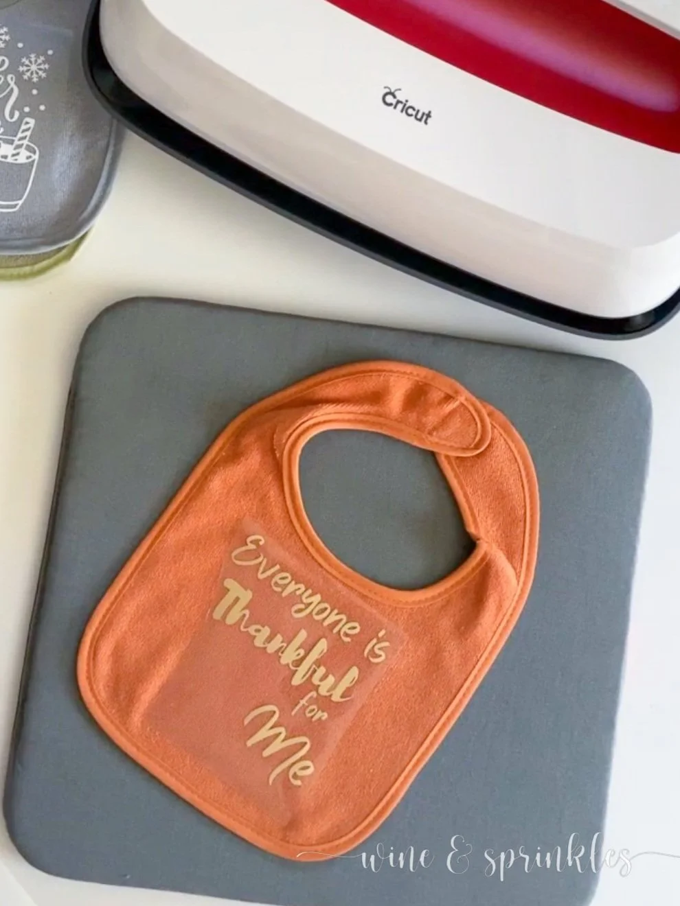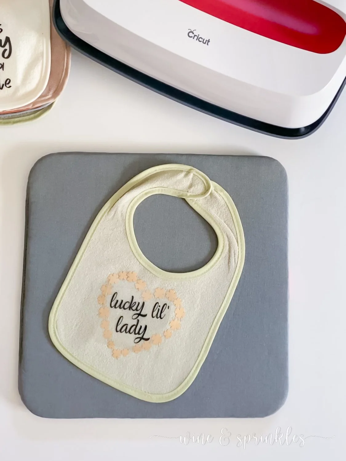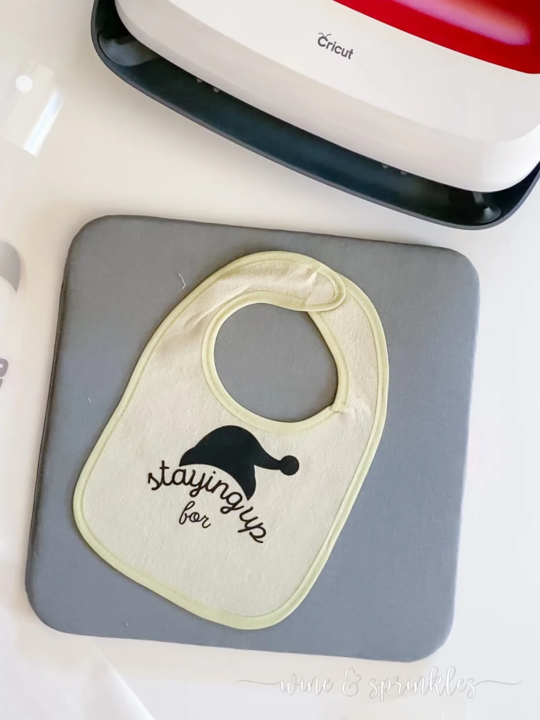 Cricut Heat Press: for transferring your decals to your bibs, you’ll need either a heat press or an iron, but I have to say I've been in love with my heat press since I first tried it! The Cricut Heat Guide makes it easy to always know what temperature and time to heat press my projects, which takes so much stress out of me worrying about scorching my fabrics! It’s also great and evenly and easily transferring all my decals, whether layered or not, and it’s a huge timesaver for mass making a bunch of HTV projects at once! When I made this and all sorts of different items for my Clothesline Basket Baby Gift, it made my assembly line of transferring and layering go quickly and smoothly with zero headaches!