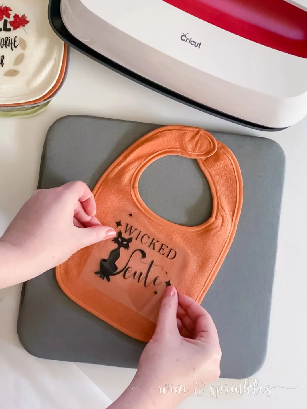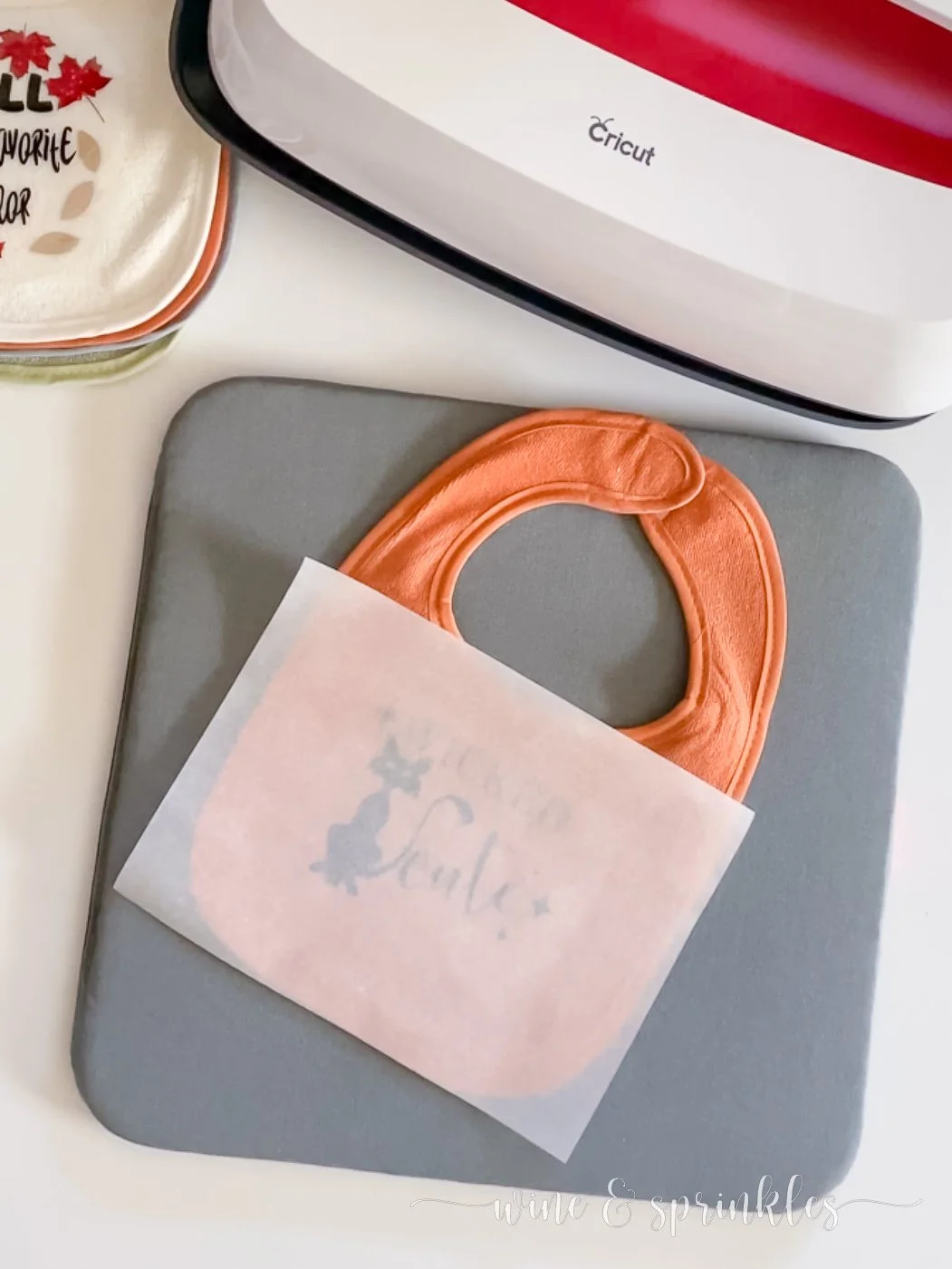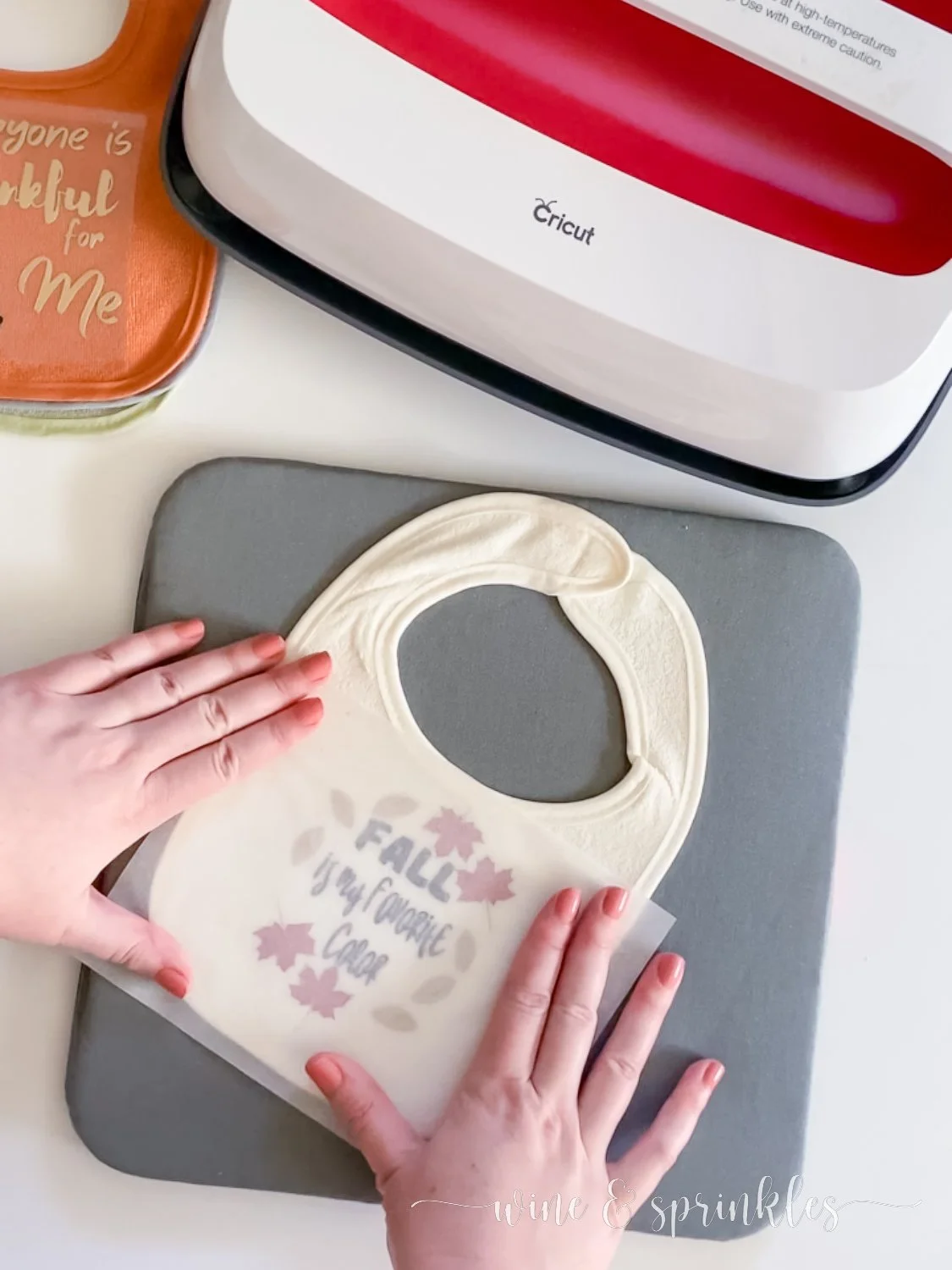 Using firm pressure, press the decal into the bib with your heat press, using the timer by pressing the Cricut symbol button, then remove the press when the timer runs out. Once the backing is cool enough to touch, carefully remove it to leave the decal on the bib. Repeat this heat pressing process, making sure to use parchment paper to protect previously pressed layers as you add each color, for each of the bib designs you are crafting, then you’re done!