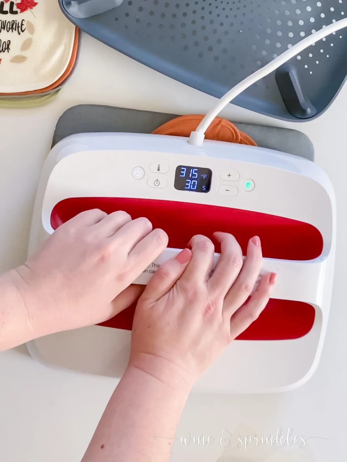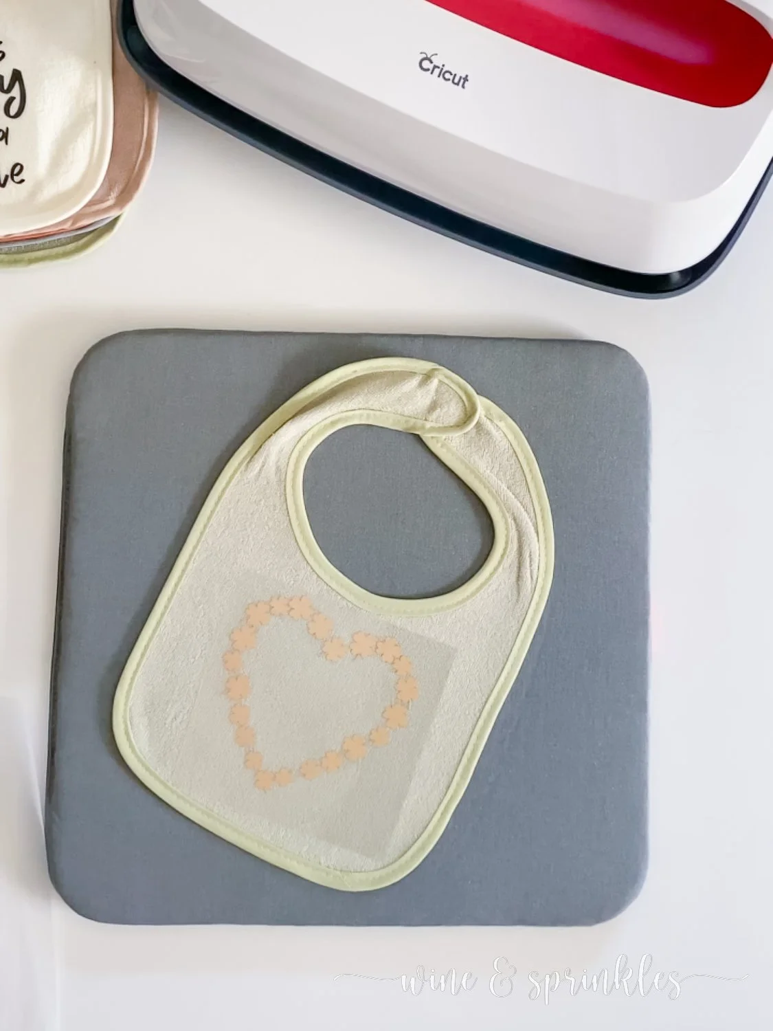 Preheat your heat press to the right temperature based on the bibs and HTV you are using, which can be found by using the Cricut Heat Guide. Change the temperature by pressing the thermometer button until the temperature on the screen blinks, then use the arrows to the right of the screen to change the temperature to what you wish. You can likewise do this for the timer by pressing the watch icon button and, once the timer is blinking, change it with the same arrows. Keep your heat press in its stand while it's preheating and anytime it's hot and you aren’t pressing something to keep you and your work surface safe! For my cotton-poly bibs and both types of HTV pressed on the heat press mat, my press was set to 315℉ for 30 seconds.