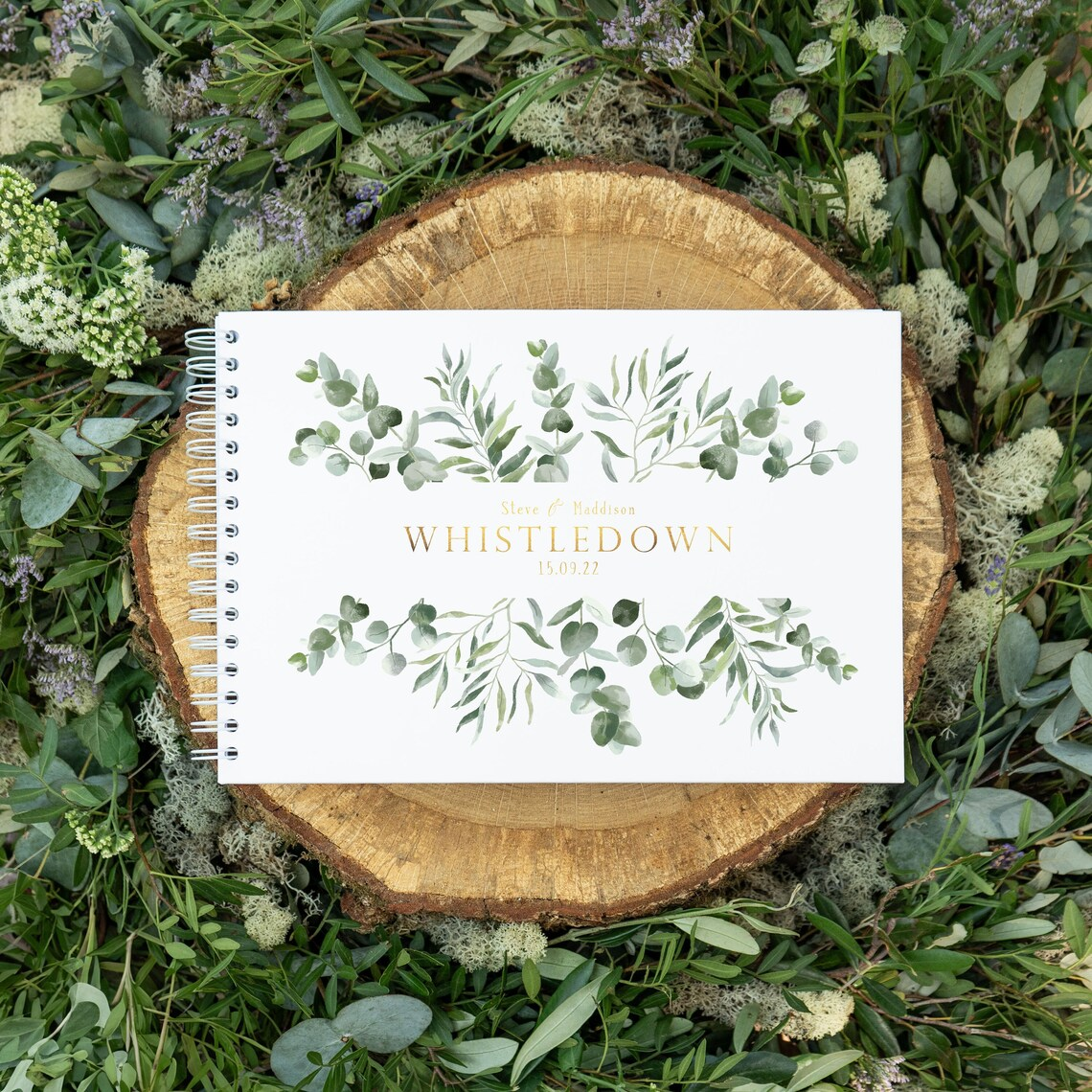 For a guest book with greenery instead of flowers, I love this personalized eucalyptus wedding guest book. Like the other options, this book features the couples first and last names with the wedding date in a golden colored script, but with the text being framed with gorgeous watercolor eucalyptus fronds instead of wildflowers.