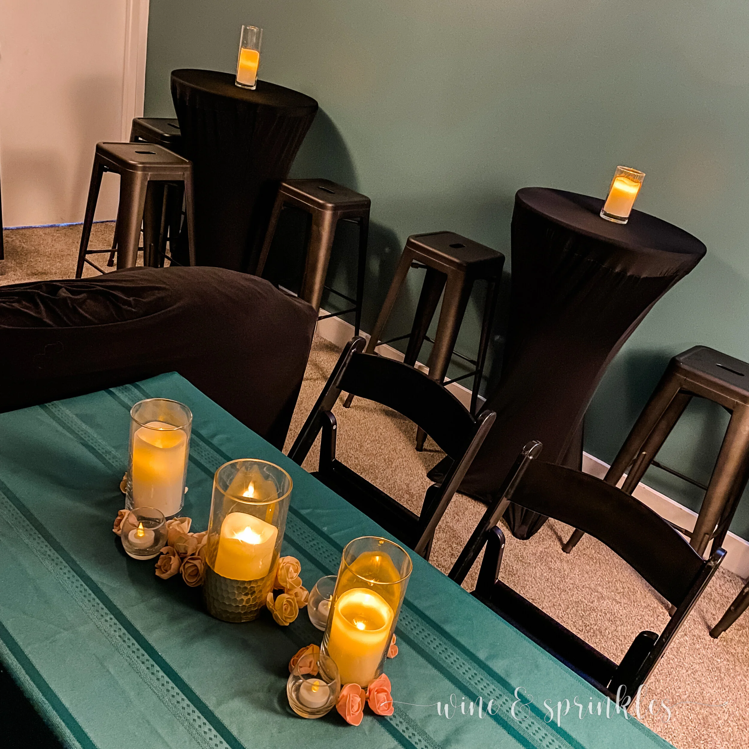 While I wanted a celestial feel I will admit that I also wanted a reason to buy paper lanterns, so when I found these Gold, White, and Cream Paper Lantern Multipacks on Amazon I knew they would be the perfect affordable accent to my cloudlike photo booth as well as to cover my LED light fixtures in the basement. This gave a casual basement bar vibe for everyone to enjoy their food at cocktail tables, each decked simply with LED candles and some prettily DIY Dyed Wooden Blossoms.
